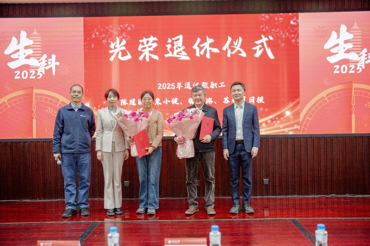 大会为2025年度光荣退休的教师陈建国、朱小健、滕俊琳、苏都莫日根举行荣休仪式。陈雪梅、石长翼向荣休教师代表颁发证书,致以崇高敬意。