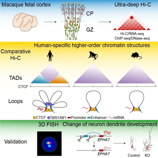 图:高分辨猕猴胎脑3D基因组图谱的构建及跨物种染色质结构进化解析,发现了人类特异调控元件影响神经细胞的树突发育