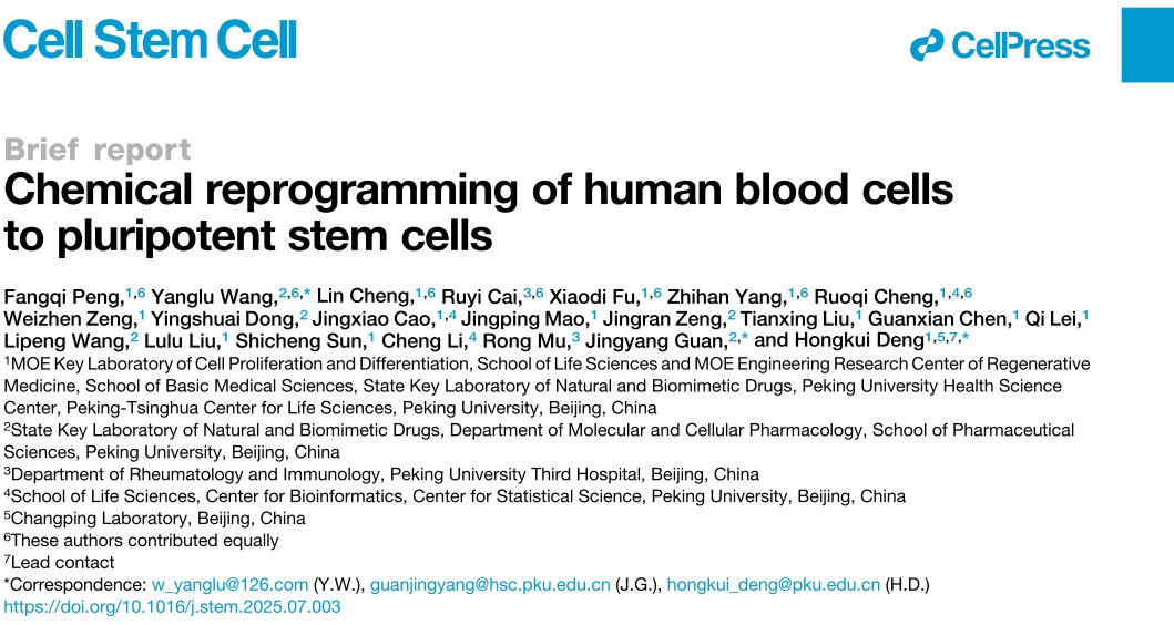 2025年7月30日,北京大学邓宏魁课题组与关景洋课题组合作,在国际学术期刊Cell Stem Cell上发表了题为“Chemical Reprogramming of Human Blood Cells to Pluripotent Stem Cells”的最新研究成果。该研究首次实现了利用化学方法将人血液细胞诱导为多能干细胞,克服了化学诱导多能干细胞制备中起始细胞来源的关键瓶颈,将进一步推动化学诱导多能干细胞技术的可及性。