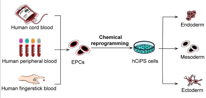 尽管在人体细胞化学重编程领域取得了诸多进展,但仍然存在一个重要挑战:寻找理想的用于重编程的人体细胞来源。皮肤成纤维细胞和脂肪基质细胞虽为常用来源,但其他类型的体细胞——特别是人类血细胞——能否通过化学重编程成功转化为hCiPS细胞,此前仍是未知数。与其它体细胞类型相比,血液细胞是最易获取、最便捷且近乎无限的组织来源。采血程序成熟、不易污染且对患者和捐献者侵入性小。更重要的是,血库中储存着大量可用于研究和应用的冻存血液样本。因此,开发一种能够从血液细胞稳定、高效制备hCiPS细胞的化学重编程策略具有重要的意义,这将克服现有化学重编程技术的局限,促进其在个体化再生医学中的广泛应用。