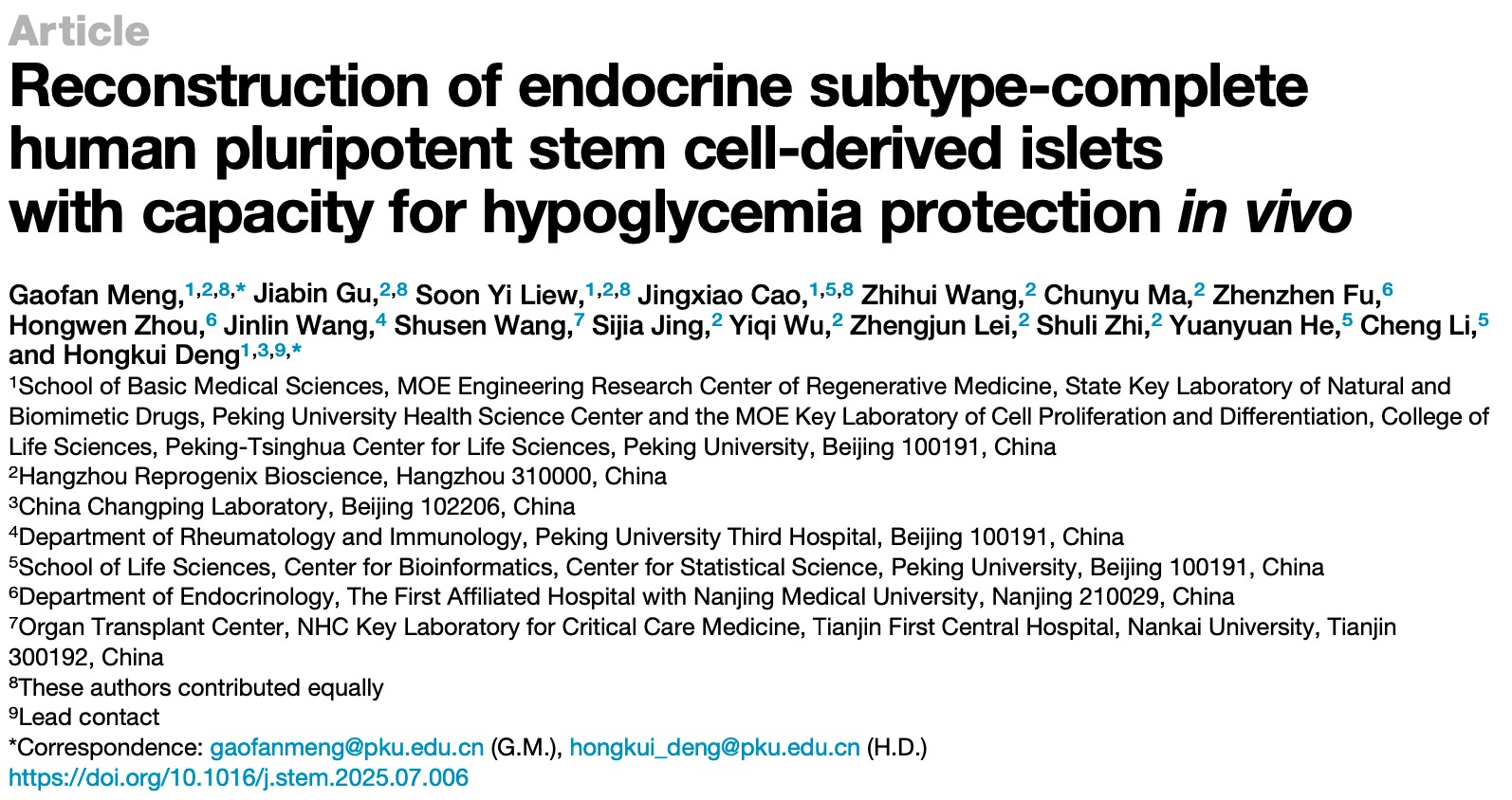 2025年8月8日,北京大学邓宏魁课题组在国际学术期刊Cell Stem Cell发表题为“Reconstruction of Endocrine Subtype-complete Human Pluripotent Stem Cell-derived Islets with Capacity for Hypoglycemia Protection in vivo”的最新研究成果(图1)。该研究首次利用人多能干细胞成功分化构建了内分泌细胞类型完备的胰岛。这些胰岛能够高效响应血糖浓度变化,不仅能够有效降低血糖,更具备关键的升血糖功能,在糖尿病小鼠模型中展现出有效的低血糖防护能力,解决了干细胞来源的胰岛细胞类型及功能不全面的难题。