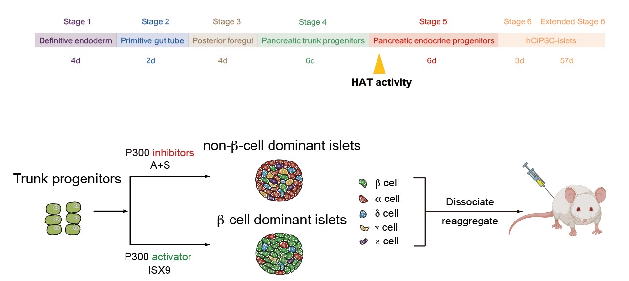 本研究中,团队通过表观小分子调控乙酰转移酶(HAT)P300/CBP活性,创新性地建立了非β内分泌细胞的高效诱导方案,结合重聚集技术成功构建了包含全部5种内分泌亚型的"重建胰岛"(图2),通过调控重建胰岛中5种内分泌细胞的配比,解决了多能干细胞分化胰岛细胞类型缺失、胰岛功能不完善的问题。值得一提的是,β细胞和非β细胞分别产生于独立的“胰岛芽”,再整合成功能性胰岛的策略,与人胰岛自然发育过程相似(J. Histochem. Cytochem., 2009; J. Clin. Endocrinol. Metab., 2012; Dev. Growth Differ., 2016),揭示了功能性内分泌细胞分化的规律。