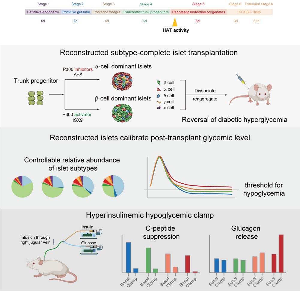 该研究基于人多能干细胞建立了首个可精确调控5种内分泌细胞比例的胰岛制备体系,实现了通过工程化定制胰岛细胞组成,重现天然胰岛的双向血糖调控功能,为移植后实现精准血糖稳态调控、避免低血糖风险奠定了基础。这一进展为干细胞来源胰岛的临床转化提供了进一步的安全保障,有助于加速糖尿病细胞治疗的临床应用进程。