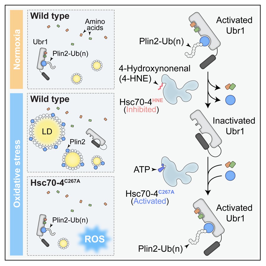 氧化应激状态下,脂质过氧化产物4-HNE通过抑制分子伴侣Hsc70-4和E3泛素连接酶Ubr1介导的氨基酸感知通路,诱导细胞内脂滴积累,从而形成一种抵抗氧化应激的保护性应答。