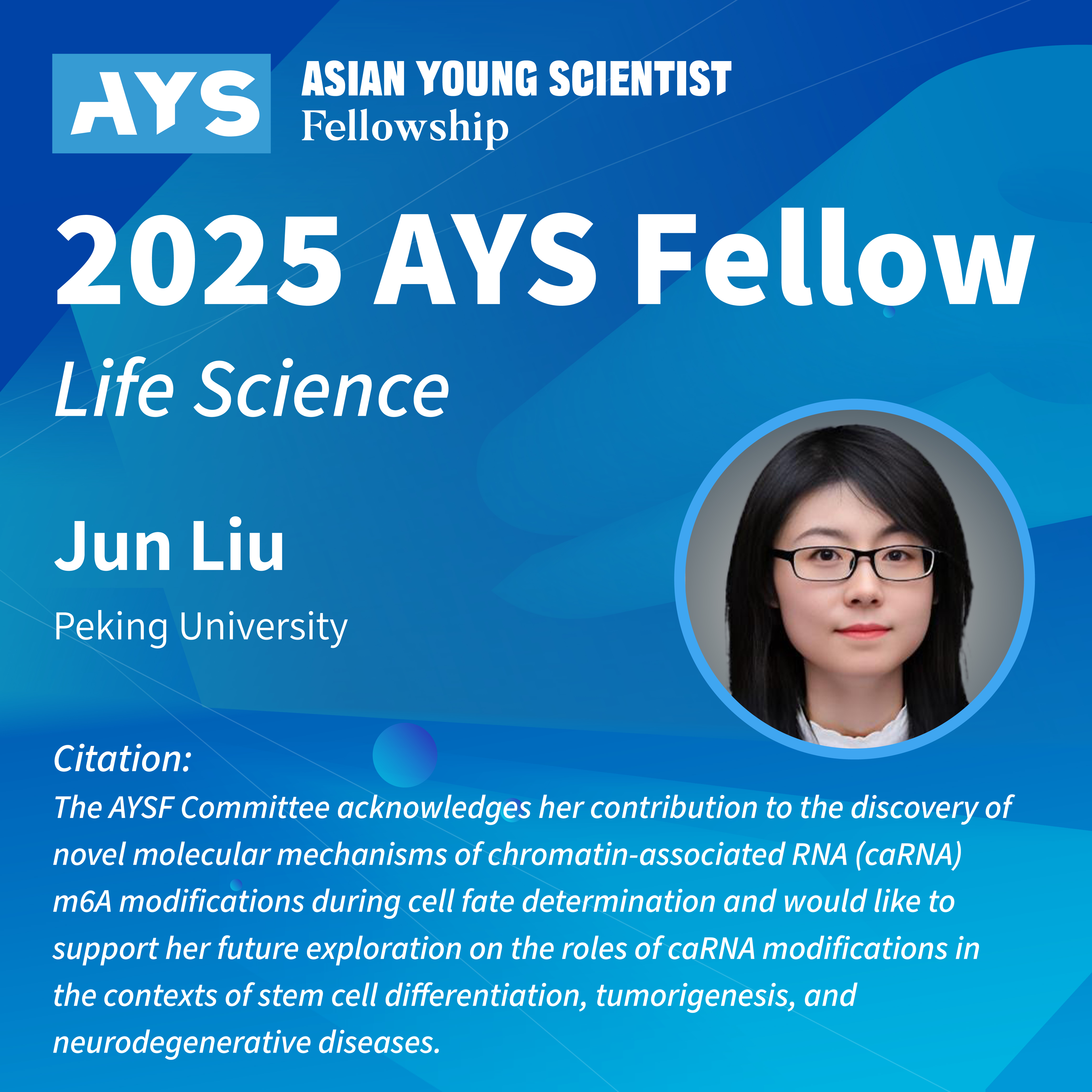AYSF委员会表彰刘君研究员在细胞命运决定过程中发现染色质相关 RNA(caRNA)m6A 修饰的新分子机制方面所做出的贡献,并支持其未来在干细胞分化、肿瘤发生以及神经退行性疾病等背景下对 caRNA 修饰作用的研究探索。