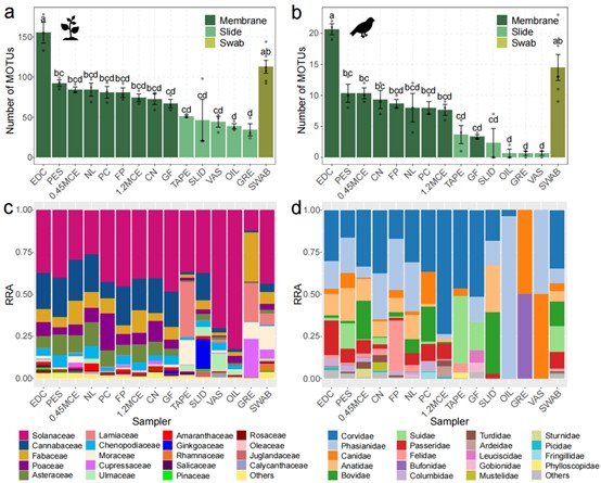 图2 不同材料植物(a)与动物(b)多样性检出效果比较及结果中各科相对丰度占比(c,d)