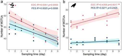 为进一步探究采样时长对eDNA吸附效果的影响,使用比较实验中效果最好的两种材料(EDC和PES),分别以1、2、3、5、7、9天的时长进行采样。结果显示空气eDNA的组成更迭很快,采样时长与检测到的植物多样性负相关,与脊椎动物多样性正相关(图3)。说明样品更多反映的是当下空气中eDNA的组成,而非多日累积的结果,增加采样频率比延长单次采样时间更可能检测到更多物种。结合采样期间同步进行的植物物候调查,eDNA检出优势类群的变化同收样当天周边植物的物候(传粉)情况相关,可反映其物候状态。