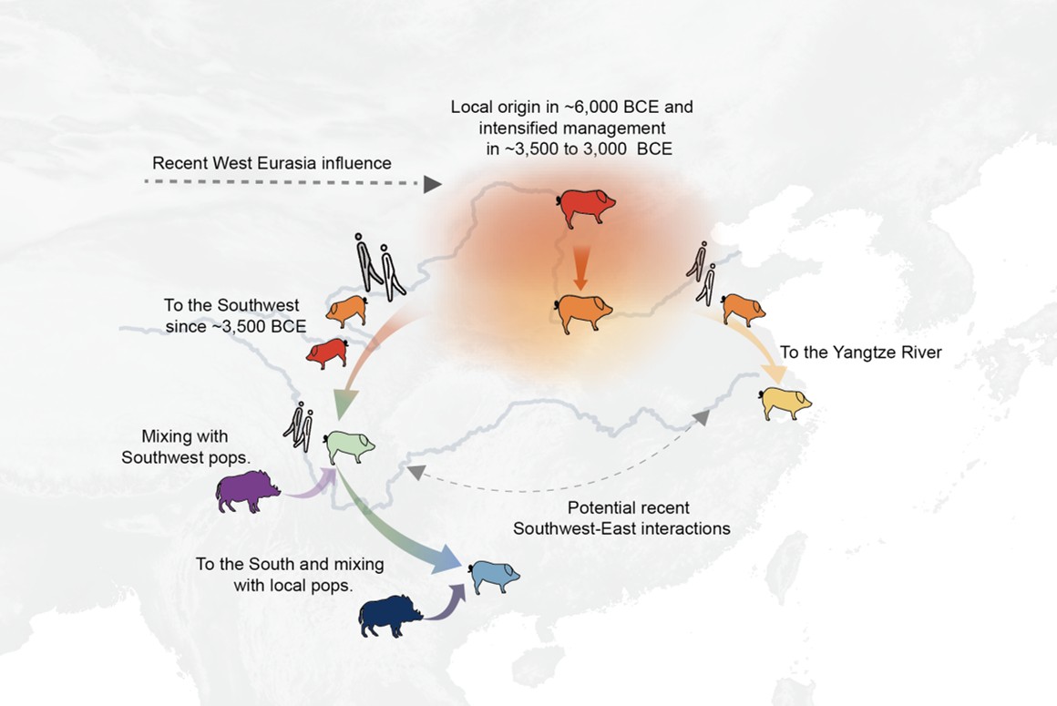 家猪的驯化是人类农业社会建立和发展的重要里程碑。在新石器时代早期,家猪在亚欧大陆两端被独立驯化。作为家猪的主要起源地之一,中国拥有近百个本土猪品种,是全球家猪遗传多样性的重要组成部分。然而长期以来,中国家猪的驯化与传播历史、与人群的互动关系,以及关键表型的起源和扩散过程仍不清晰。