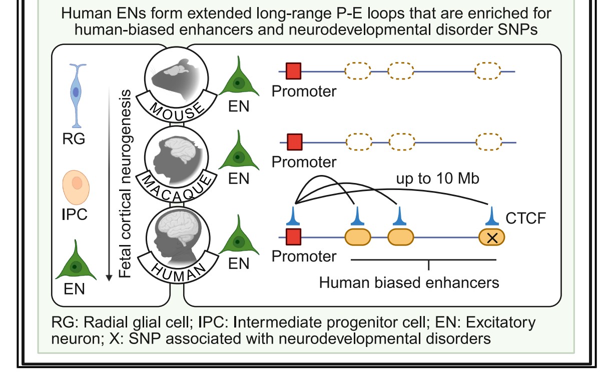 综上,该研究开发了具有广泛应用潜力的新技术SCOPE-C,能够在低细胞量条件下同时捕获开放染色质及其间的相互作用。利用这一方法,研究人员绘制了人类、猕猴和小鼠胎脑皮层发育过程中多种细胞类型的高分辨率调控元件互作图谱。跨物种比较分析揭示了人类特有的长程增强子网络,凸显了人脑在发育和进化过程中的独特调控特征。该成果为理解人类大脑的特殊发育模式与疾病的遗传基础提供了新线索。