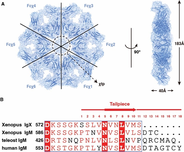 IgM抗体在演化上最为古老,广泛存在于有颌脊椎动物中。在哺乳动物中,IgM通过其重链末端18个氨基酸组成的“尾片(tailpiece, tp)”区域与J链结合,组装成稳定的五聚体 (1)。这一组装形式不仅维持了IgM五聚体的稳定性,还使得J链以独特的方式参与和 IgM受体、及结合蛋白的相互作用,从而调节IgM的功能 (1–4)。在缺乏J链的情况下,IgM可形成部分六聚体及四聚体、五聚体等聚合形式。除了能以多价态的方式结合并中和病原,IgM 还能高效激活补体系统,协同清除病原和异常细胞 (5, 6)。值得注意的是,天然IgM六聚体的含量虽然很低,但由于在结构上与C1q的六聚体结构更为匹配,因此比IgM五聚体具有更强的补体激活能力 (7–10)。