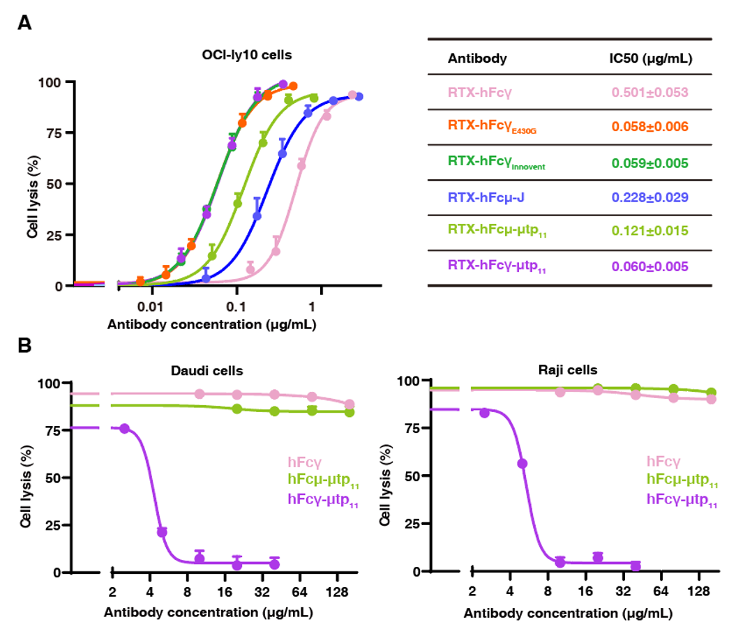值得一提的是,将来自 IgM 的截短的μtp(μtp11)引入人源IgG,也能构建出稳定的IgG六聚体(图2C)。在功能验证中,本研究设计了靶向CD20的IgM与IgG六聚体,并在OCI-Ly10、Daudi、Raji等多种B淋巴瘤细胞中测试其杀伤效果。结果显示,这些工程化的六聚体抗体在细胞层面展示显著增强的补体依赖性细胞毒性(complement-dependent cytotoxicity, CDC)(图3A)。此外,改造后的IgG-Fc六聚体还可以作为“分子诱饵”,在细胞层面抑制过度激活的补体反应(图3B)。