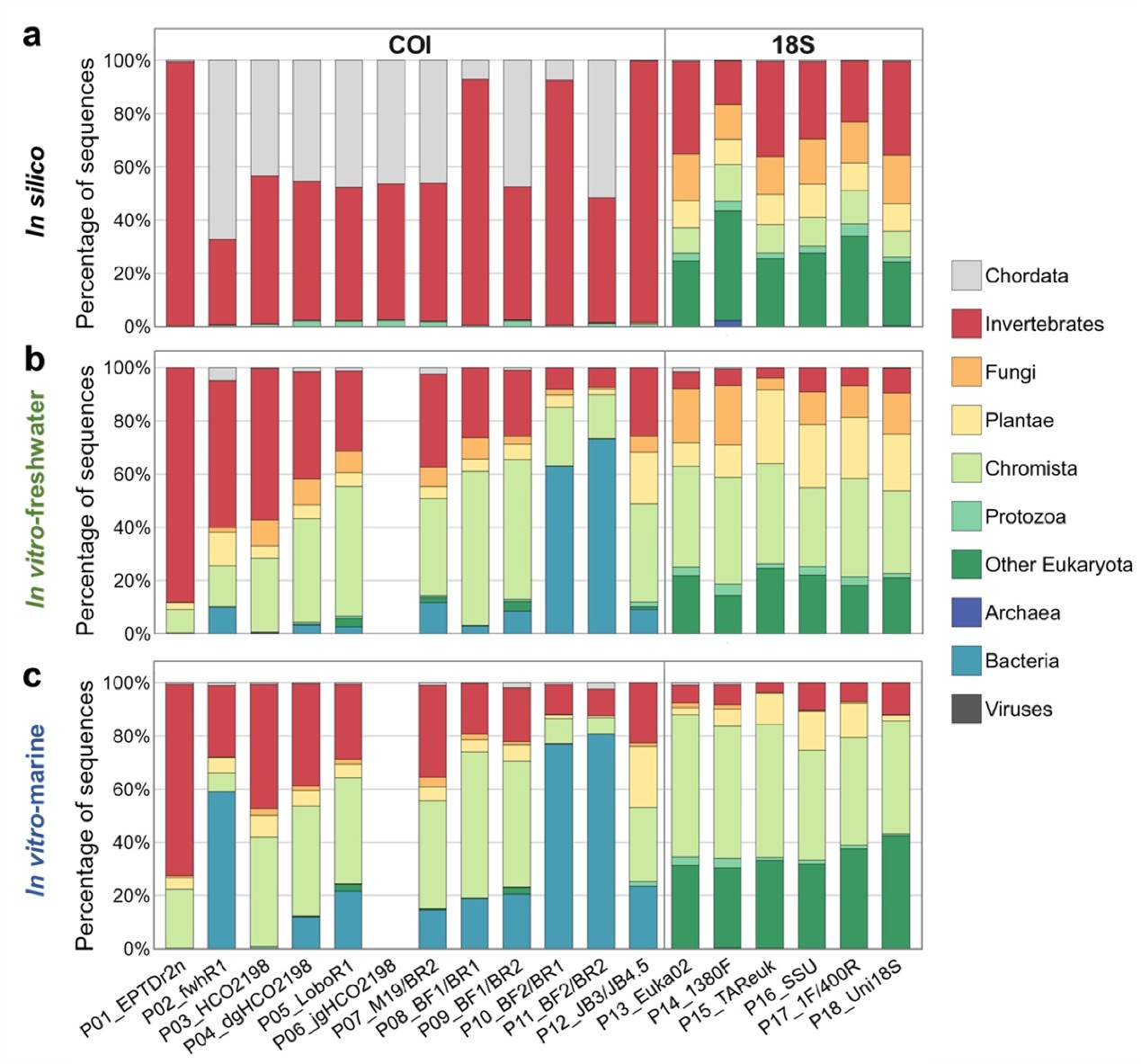 图3. COI与18S引物扩增序列的各类群组成占比。(a)基于in silico PCR分析;(b)基于淡水eDNA样本的in vitro PCR分析;(c)基于海洋eDNA样本的in vitro PCR分析