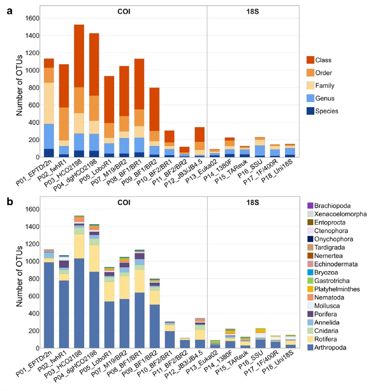 图4. 基于淡水eDNA样本的in vitro PCR分析结果,展示各引物的无脊椎分类分辨率(a)及门级类群组成(b)