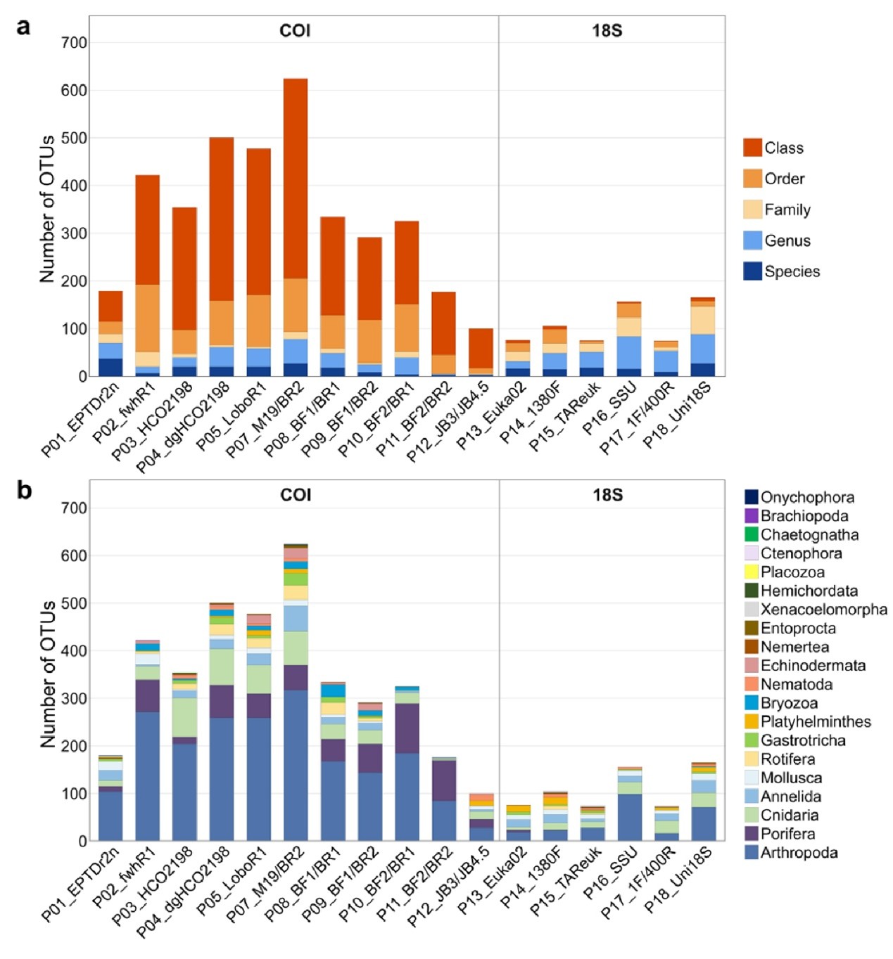 图5. 基于海洋eDNA样本的in vitro PCR分析结果,展示各引物的无脊椎分类分辨率(a)及门级类群组成(b)