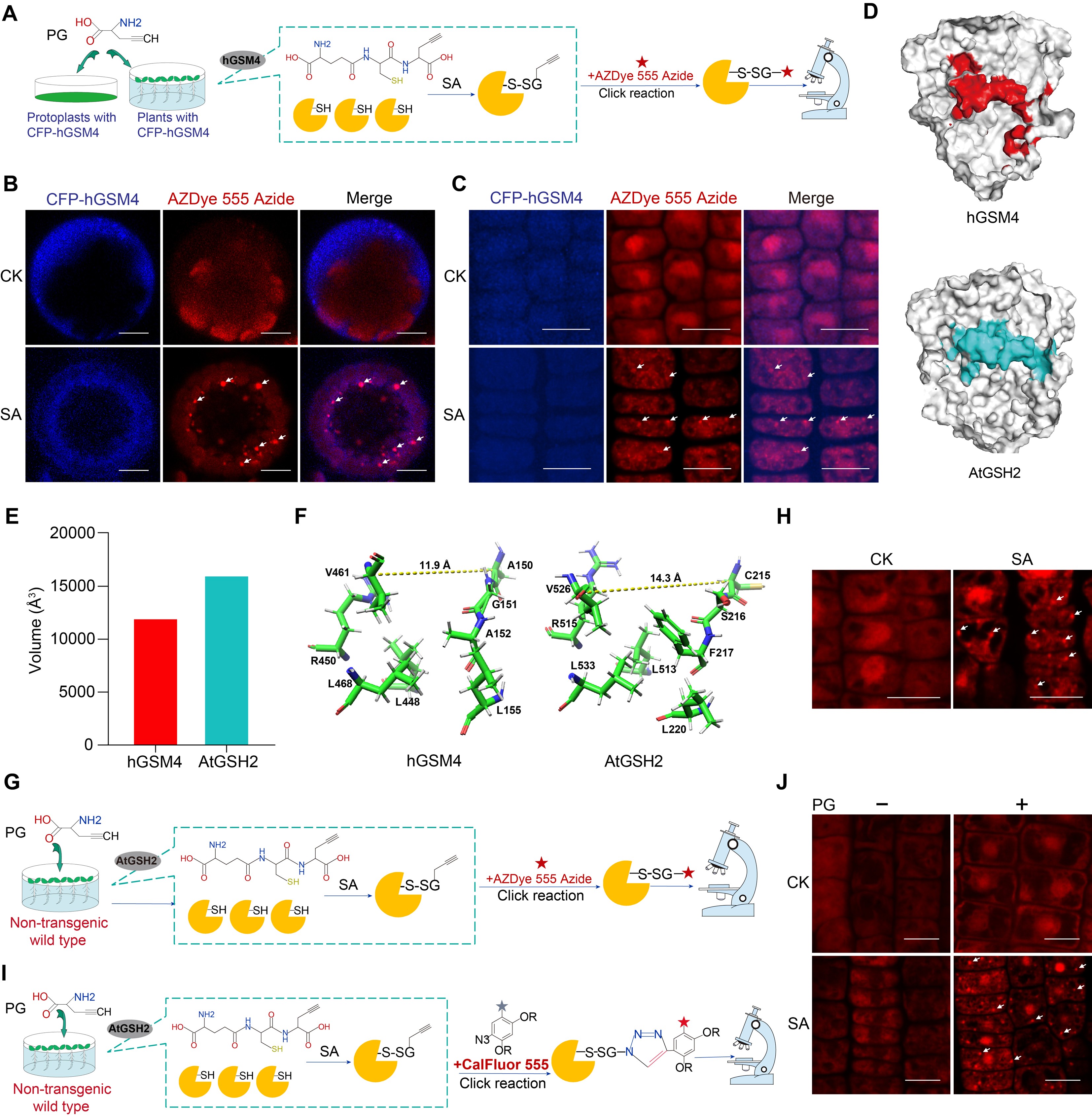 为进一步深入研究SG的功能和GSH调控的细胞内氧化还原关系,作者开发了基于激活型荧光探针的点击化学反应实现了蛋白质谷胱甘肽化修饰的活体成像技术(Click-activated metabolic Labeling and imaging of glutathionylation,CamLog)。该技术无需转入外源基因,可实现天然生理条件下谷胱甘肽化修饰蛋白的动态可视化。借助CamLog技术,作者成功在拟南芥根部观察到SA诱导形成的谷胱甘肽化蛋白凝聚体(图1)。