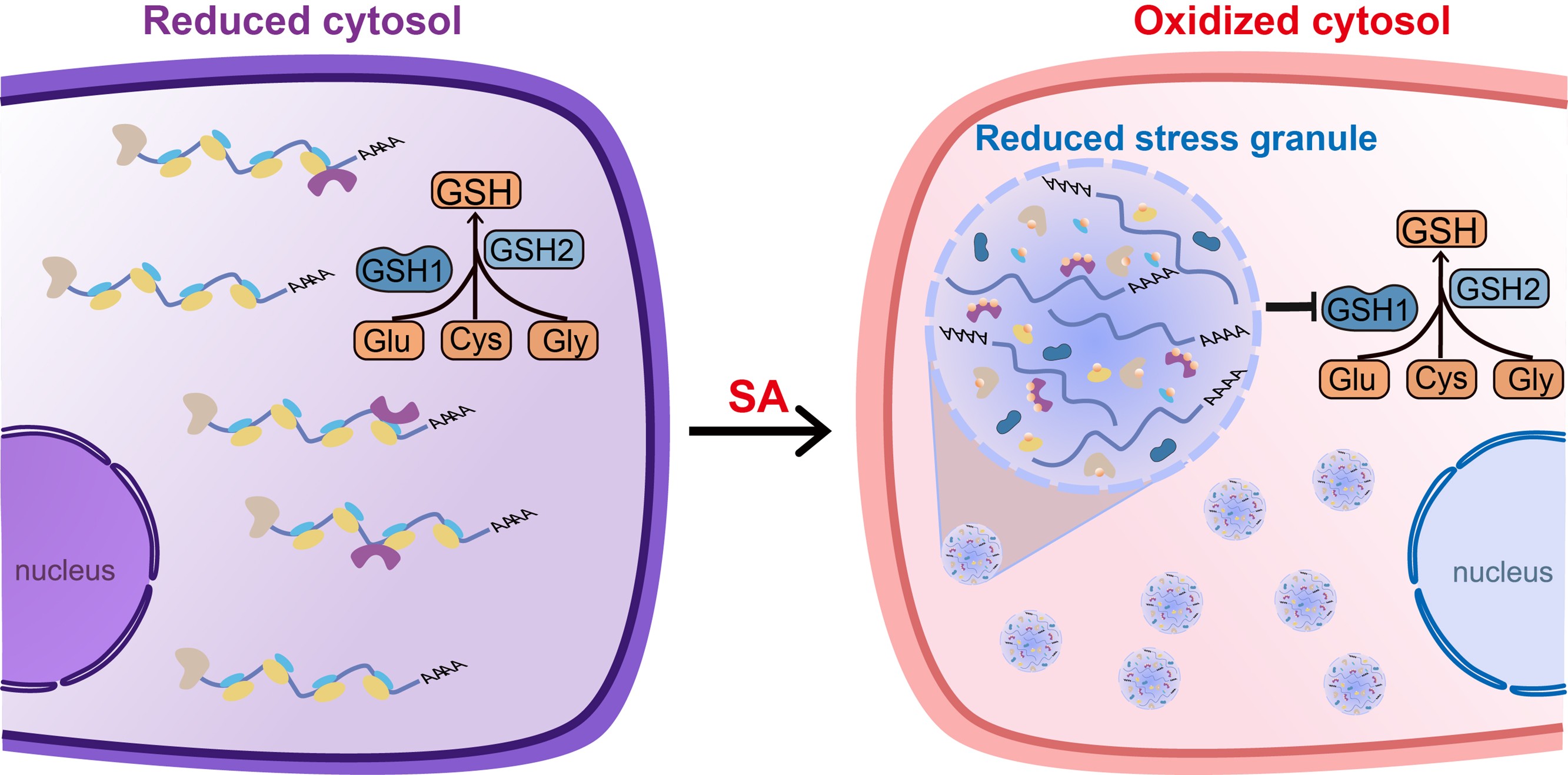 王伟课题组前期研究发现,在水杨酸(Salicylic Acid,SA)诱导的氧化应激条件下,细胞会大量形成由RNA与蛋白组成的SG,这类无膜细胞器可招募mRNA及翻译相关元件,从而调控应激状态下的细胞翻译水平[4]。在此基础上,作者进一步观察到,SG同时富集了大量与GSH合成及代谢相关的酶及蛋白,提示其可能参与细胞氧化还原调控。