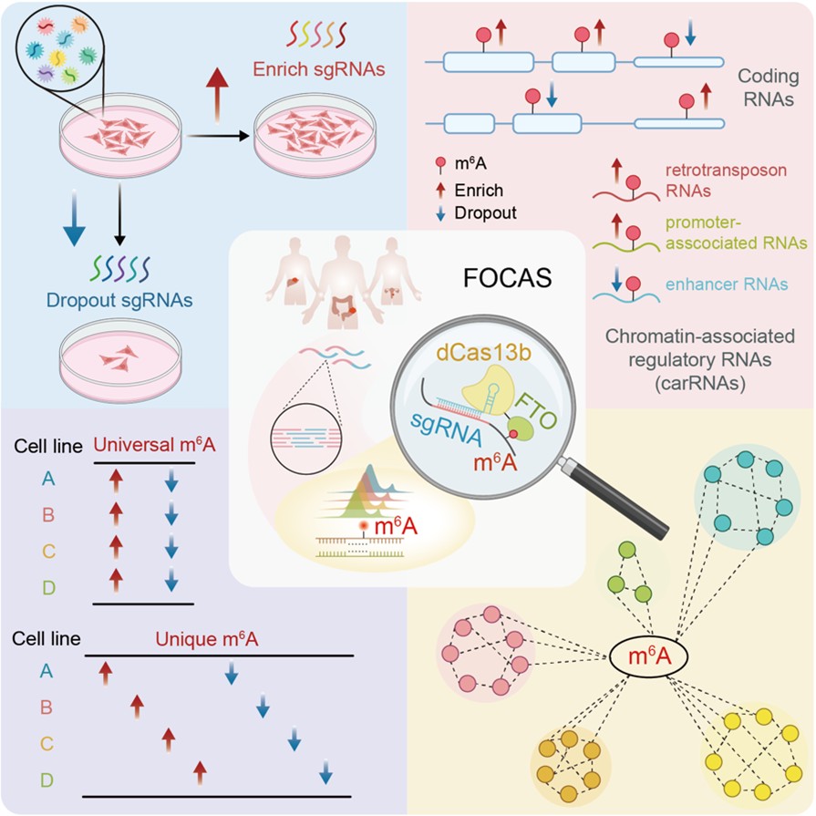 2025年12月31日,bat365中文官网登录入口、北大-清华生命科学联合中心、北京大学核糖核酸北京研究中心刘君课题组在Cell发表了题为“FOCAS: Transcriptome-wide screening of individual m6A sites functionally dissects epitranscriptomic control of gene expression in cancer”的研究论文。该研究建立了FOCAS(Functional m6A Sites Detection by CRISPR-dCas13b-FTO Screening)方法,实现了m6A功能研究在位点分辨率上的关键突破。FOCAS基于改造的CRISPR-dCas13b系统,将去甲基化酶FTO精准定位至RNA特定区域,从而在不改变DNA/RNA序列和不显著影响全局m6A水平的前提下,实现对特定m6A修饰位点的靶向去甲基化。这一策略不仅适用于mRNA,还可以同时覆盖非编码RNA,为在全转录组尺度上系统解析m6A的功能提供了技术基础。