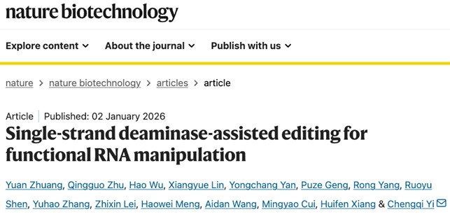 2026年1月2日,北京大学伊成器课题组在Nature Biotechnology在线发表了题为Single-strand deaminase-assisted editing for functional RNA manipulation的研究论文。该研究建立了由单链脱氨酶辅助的可调节RNA信息操纵平台AIM(adjustable RNA information manipulation)。该平台突破了目前RNA碱基编辑工具“单点编辑”的限制,实现了在RNA靶向区域内对不同数量、多种类型碱基的可控与精准操纵,为RNA功能研究与疾病干预提供了强大的底层技术支撑。