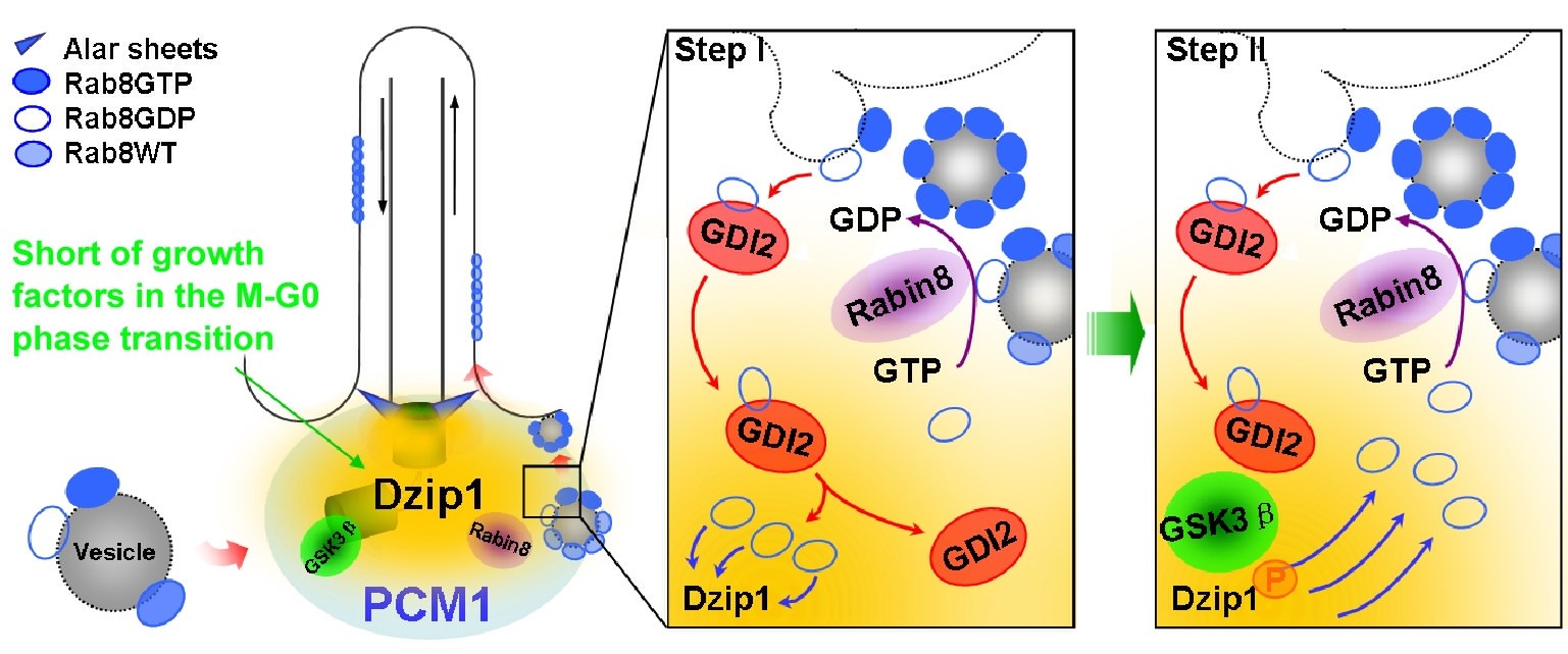 图注:Dzip1调控M-G0期转化过程中纤毛的组装。Dzip1定位至基体,具有促进Rab8GDP从其抑制因子GDI2解离的能力(step I);当细胞周期进入静止期,GSK3β激酶磷酸化Dzip1,从而促进GDI2释放Rab8GDP(step II)。该过程为中心粒外周活性Rab8GTP的产生提供了物质基础,进而促进M-G0转化时期的纤毛组装。