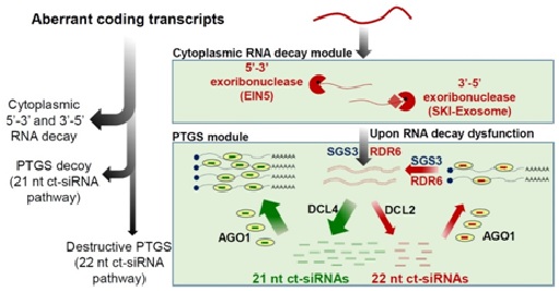郭红卫课题组利用一个拟南芥转基因株系作为背景,通过正向遗传学的策略成功筛选到多个发生转基因沉默的抑制子突变体。克隆基因发现三个突变基因均为细胞质RNA降解途径的必需组分(5’ -3’和3’-5’降解途径),表明细胞质RNA降解途径抑制转基因沉默。两条RNA降解途径在真核生物中非常保守,在拟南芥中,阻断一条途径植物生长发育基本正常,表明这两条RNA降解途径在植物发育中存在功能冗余。当两条途径被同时缺失突变后,植物表现出严重的发育缺陷,包括发育延迟,分生组织缺陷,不育等,极端情况下导致胚胎致死。与此对应,植物在全基因组水平的基因表达情况出现明显紊乱。有意思的是,阻断RNAi途径后,两条RNA降解途径突变体所表现的发育缺陷几乎完全得到矫正,同时75%以上的基因表达紊乱可以得到恢复。利用小RNA测序方法发现,两条RNA降解途径的缺失导致一系列蛋白编码基因(441个)产生了高丰度的长度为21-22核苷酸的次级小干扰RNA(被命名为ct-siRNA),这类小干扰RNA的产生依赖RDR6-DCL4/2途径,其功能部分依赖AGO1。进一步研究表明,至少一部分小干扰RNA对其同源基因的表达产生抑制作用,进而导致多方面的发育缺陷。