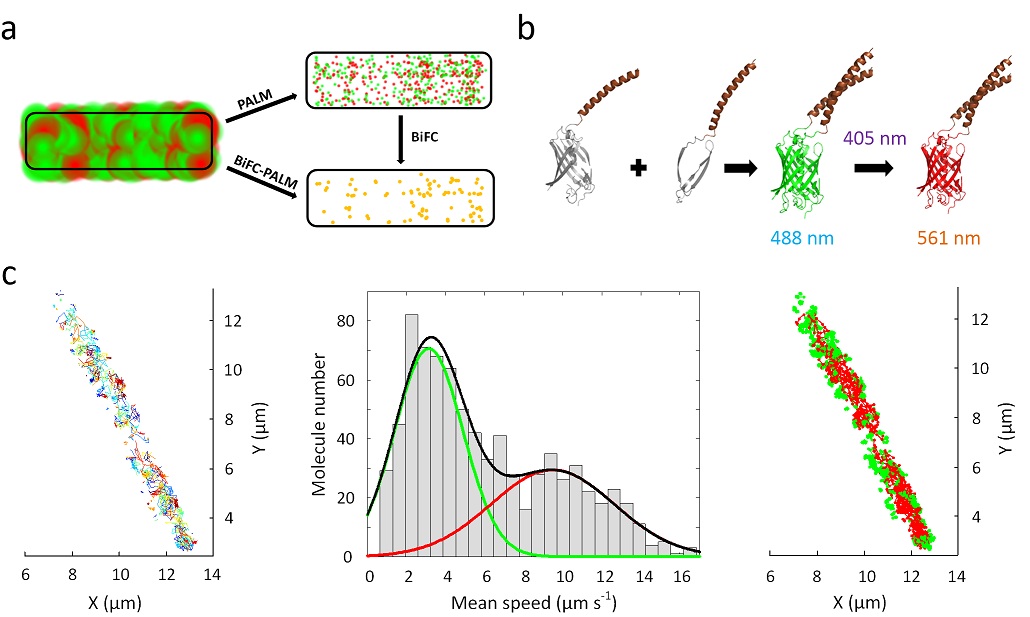 该课题组应用此方法研究大肠杆菌内高丰度蛋白细菌骨架蛋白MreB和翻译延伸因子EF-Tu的相互作用并观察到了极为有趣的依赖于亚细胞定位的运动模式。揭示了MreB–EFTu互作在细菌形态维持方面的重要作用。这也是第一次实现在亚衍射极限内观察高密度的蛋白-蛋白相互作用。
