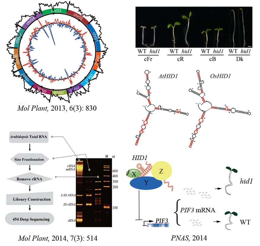 团队在前期工作的基础上通过大规模反向遗传学筛选,获得了一个特异在红光条件下产生光形态建成不敏感表型的ncRNA突变体。研究确定了主效ncRNA分子可作为新层次调节因子参与拟南芥幼苗光形态建成的调节,并将其命名为HID1(HIDDEN TREASURE 1)。结合遗传学与分子生物学手段,该项目揭示了HID1主要通过反式作用的方式直接参与抑制光形态建成关键抑制因子PHYTOCHROME-INTERACTING FACTOR 3 (PIF3)基因的转录,从而介导拟南芥红光信号中的下胚轴伸长抑制。同时,该工作发现了HID1分子在红光下发挥功能的关键结构序列,并阐明了这些序列结构与功能的保守性。HID1分子的发现不仅揭示了植物光控发育过程中调节型RNA因子的参与,而且HID1的结构、功能与进化方面的分析将为进一步揭示高等植物中较长ncRNA的作用机理提供一个值得深入研究的典型案例。上述研究成果于2014年6月30日在《美国科学院院报》(Proceedings of the National Academy of Sciences of the United States of America)在线发表,题目为Arabidopsis noncoding RNA mediates control of photomorphogenesis by red light (http://www.pnas.org/content/early/2014/06/26/1409457111.abstract),博士生王玉秋为文章的第一作者,朱丹萌副研究员与邓兴旺教授是本文的共同通讯作者。