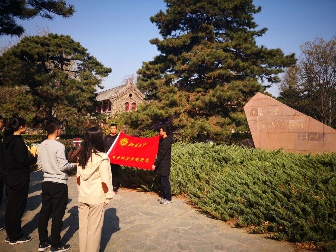 首先同学们来到静园革命烈士纪念碑前。由张天一同学介绍纪念碑的来历和其背后的历史,使在场的同学们进一步了解了老一辈北大人于民族危难之际做出的历史抉择,切身体会到了革命烈士的伟大牺牲并明确了向前辈学习的决心。之后同学们在革命烈士纪念碑前向团旗庄严宣誓,为革命烈士献花并默哀三分钟。张璐瑶老师为同学们讲述了部分烈士的先进事迹,同学们都颇受感动,深刻地认识到了自己作为北大人同国家民族的紧密联系。