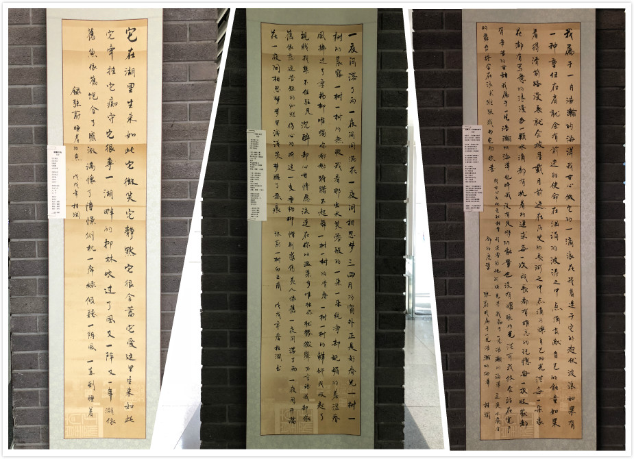 在北京大学百廿校庆周,这些以书法形式呈现的学院老师们原创的诗词,在金光生命科学大楼的入门厅处展出,用诗词之美歌颂燕园,为百廿北大庆生,同时也供师生和返校校友们驻足,雅俗共赏。