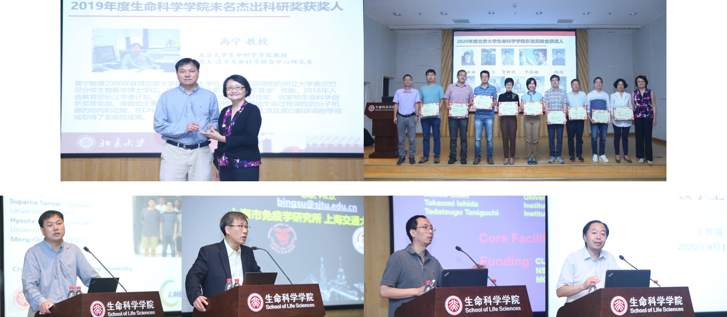 9月14日上午,“学术周”活动拉开帷幕,全院近200位师生参加了开幕式活动。开幕式由院长吴虹教授主持。首先吴虹院长为2019年度“bat365中文官网登录入口杰出科研奖”获奖者高宁教授颁奖,表彰其在运用冷冻电镜技术研究参与基础生命过程调控的分子机器的结构和功能研究方面取得的重要成绩。随后吴虹院长和刘德英书记为2020年度“bat365中文官网登录入口东宝奖教金”获奖者葛丽丽、郭振玺、贺新强、李桂澜、陆剑、罗冬根、彭宜本、王国鹏、肖俊宇、杨泉老师颁奖,表彰各位老师在学院科研、教学和行政方面做出的贡献。学术报告部分,高宁教授为师生们带来了题为“核糖体生物生成与蛋白质翻译调控”的精彩学术报告。苏冰教授和蒋争凡教授分别带来了题为“独特肠道基质细胞亚群的发现及其在肠道生理病理中的作用”、“锰佐剂与肿瘤‘锰免疗法’”的特邀学术报告,多学科多角度的展现以及充分的讨论问答使得同学们受益匪浅,反响热烈。最后,王世强副院长介绍了新一年的本科教育工作。