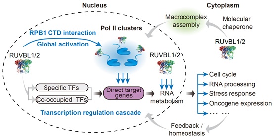 作为分子伴侣,RUVBL1/2参与复合体众多,包括RNA聚合酶的组装,染色质调控和转录后RNA加工相关复合体等,先前研究表明,RUVBL1/2在细胞核中主要与特定转录因子相互作用发挥转录共激活或抑制的功能(灰色箭头)。本研究主要发现证明了RUVBL1/2通过直接与Pol II CTD互作促进活跃启动子附近Pol II转录凝聚体的形成,从而发挥增强转录活性的功能(蓝色箭头),多种转录因子共同参与了该生物学过程。